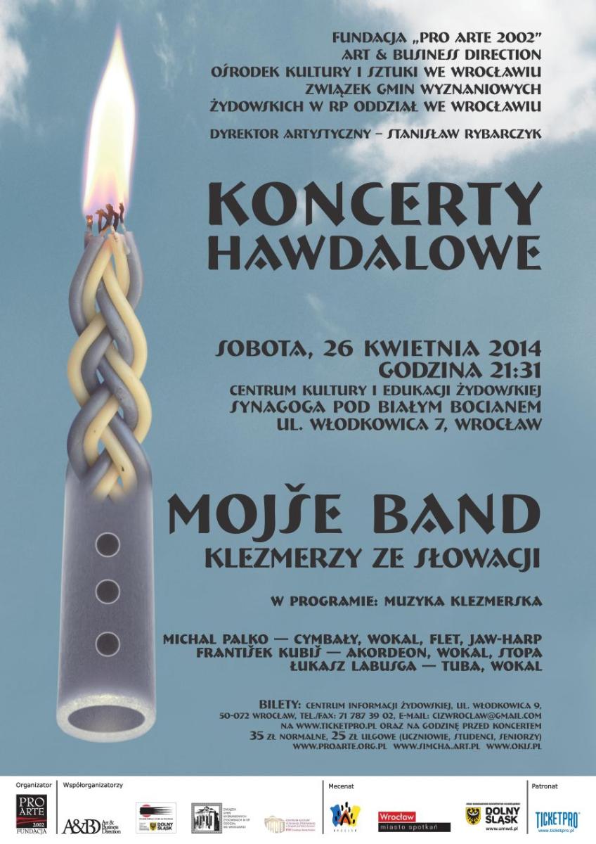 Mojše Band/ Mojsze Band – słowaccy klezmerzy na zakończenie hawdali w sobotę 26 kwietnia o godz. 21.31 w Synagodze pod Białym Bocianem. bilety: 35 zł normalne, 25 zł ulgowe (uczniowie, studenci, seniorzy). Do kupienia w Centrum Informacji Turystycznej i Rowerowej , ul. św. Antoniego 8, 50-073 Wrocław tel. 71 346 15 34, e-mail: [email protected]…